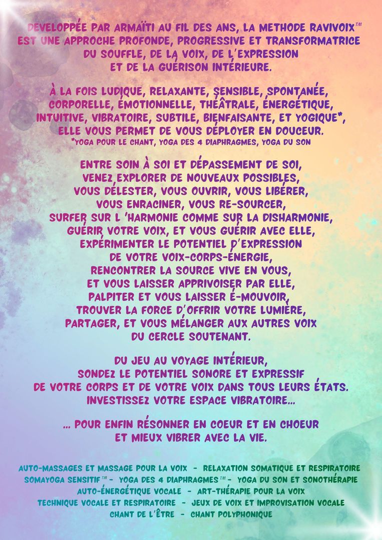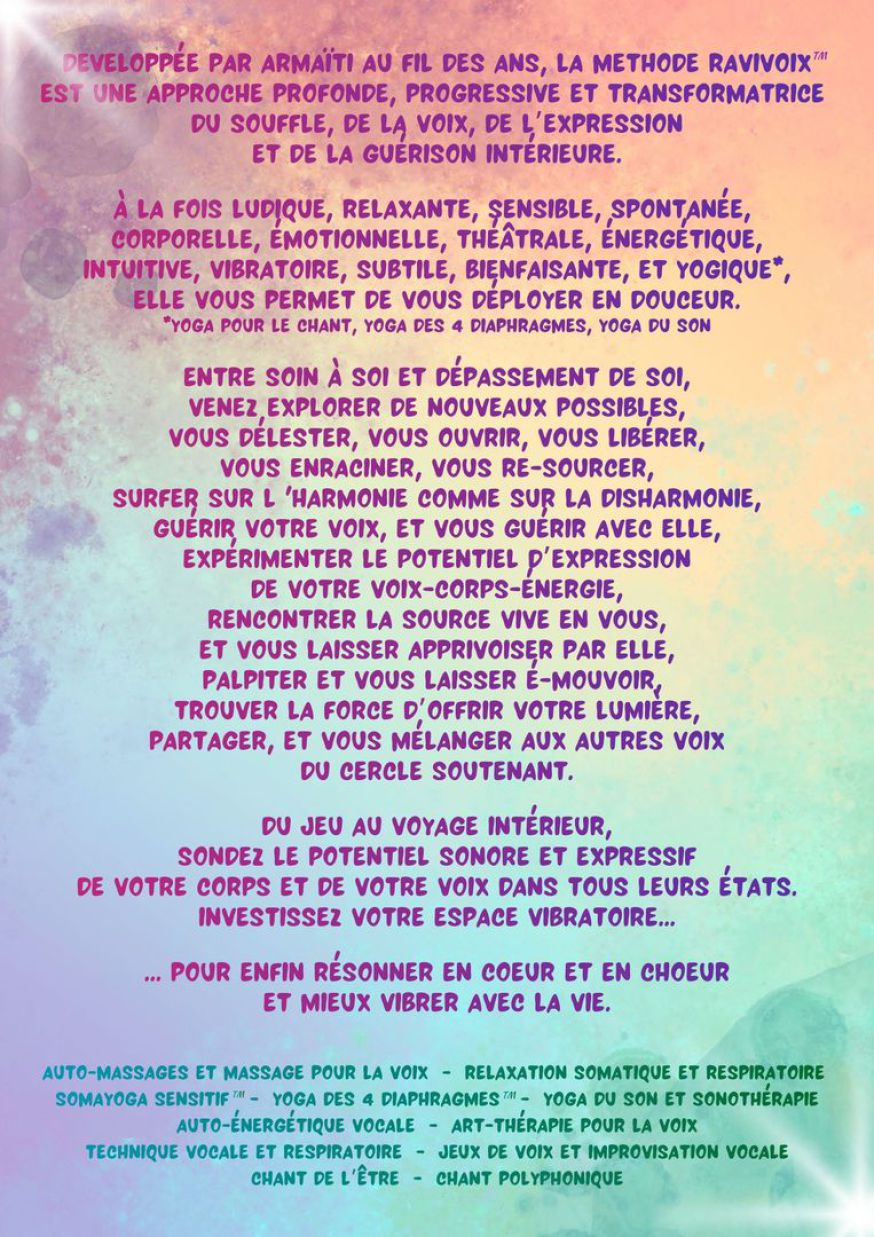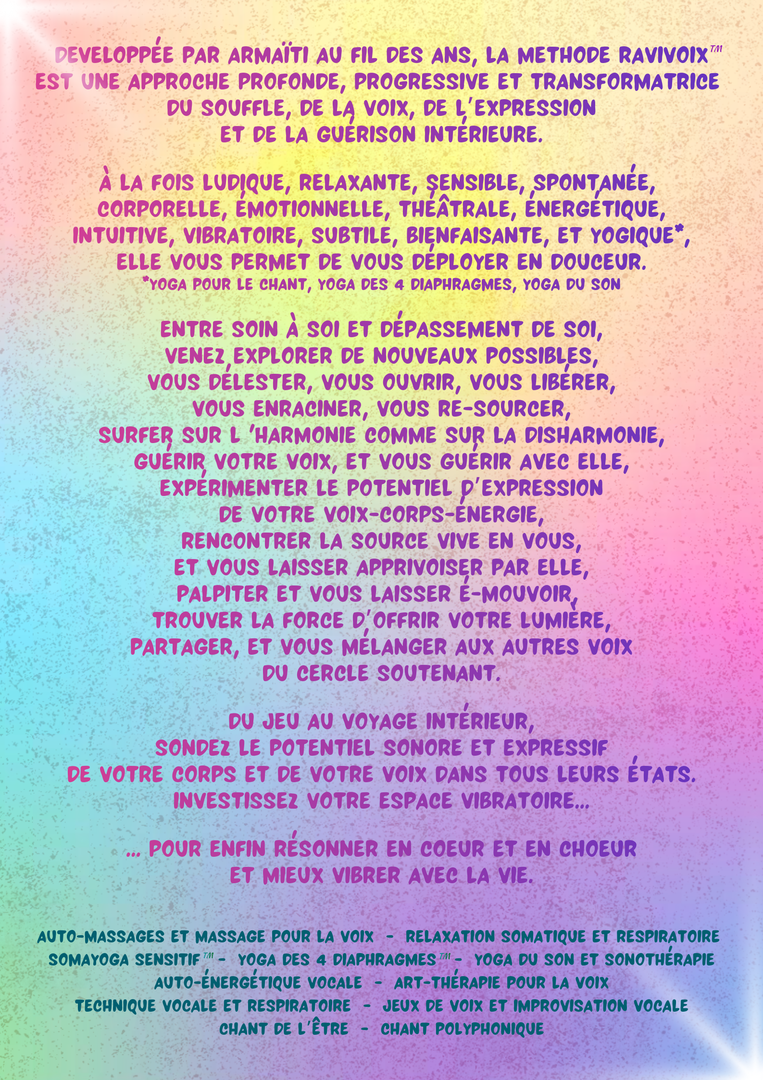 Novatrice, en perpétuelle création, je développe depuis plusieurs année la Méthode RaviVoix™ : une approche holistique, ludique et sensible, pour explorer, oser et transformer sa voix, la guérir, et se guérir avec elle...