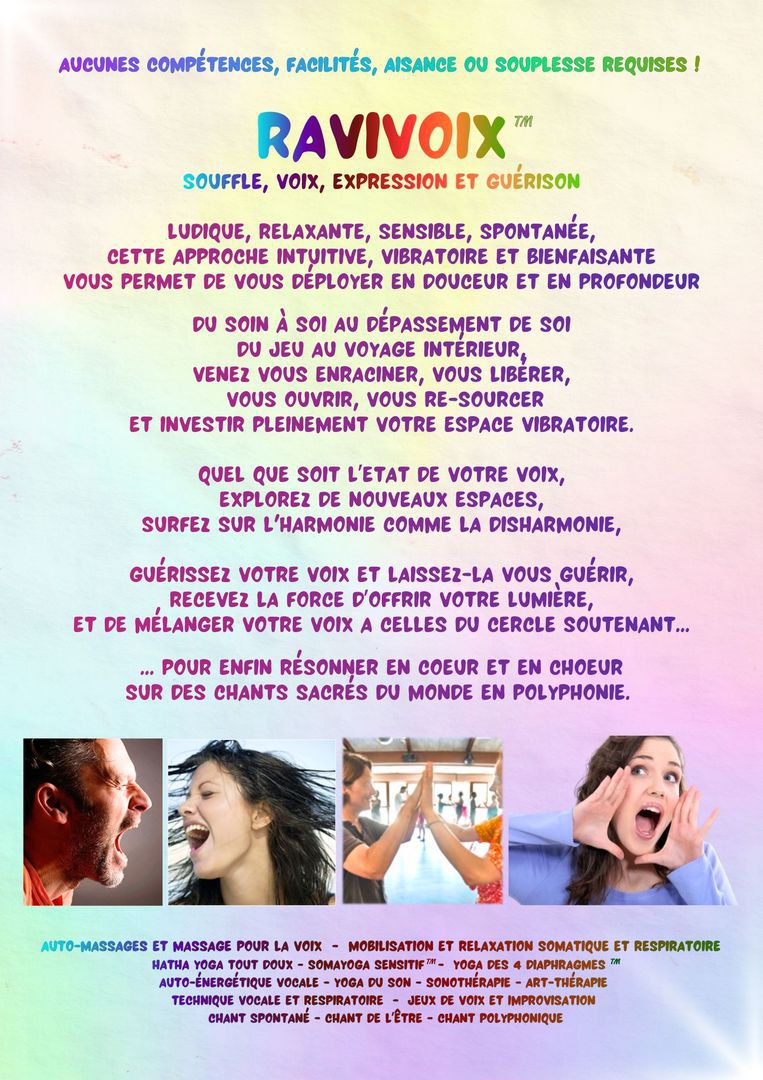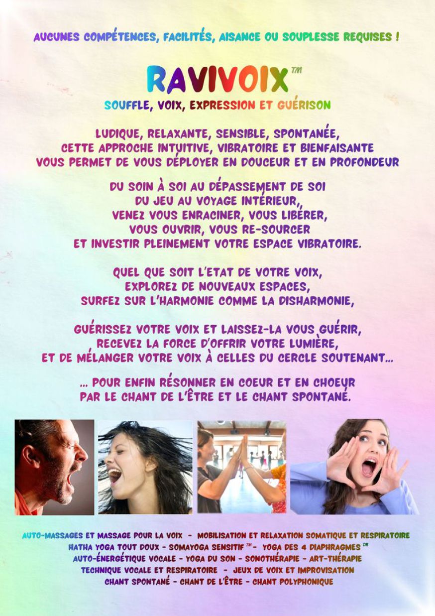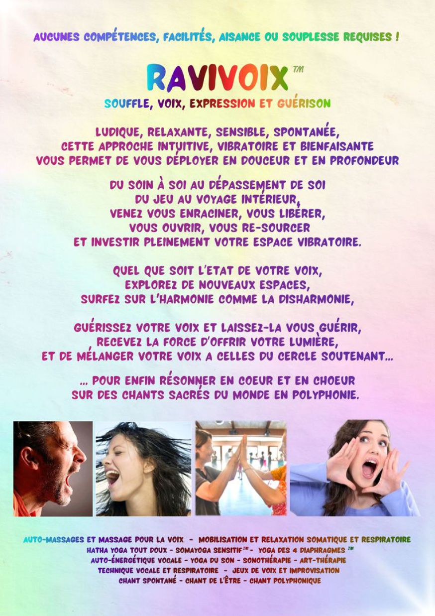 Novatrice, en perpétuelle création, je développe depuis plusieurs année la Méthode RaviVoix™ : une approche holistique, ludique et sensible, pour explorer, oser et transformer sa voix, la guérir, et se guérir avec elle...